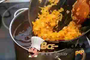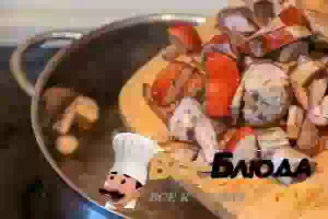 6. В глубокой сковороде разогреть растительное масло и пассеровать до мягкости лук вместе с морковью. Переложить пассерованные овощи в кастрюлю с грибами и продолжать варить еще примерно 10 минут.