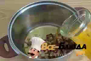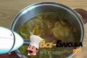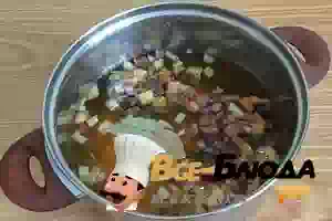 2. Грибы переложить в суповую кастрюлю и залить куриным бульоном. Довести до кипения на небольшом огне.