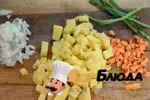 1. Подготовить фарш для фрикаделек или купить готовый. Посолить, поперчить, добавить сушеный чабрец и хорошо перемешать, время от времени отбивая фарш о дно миски. Это поможет сделать его более вязким. Если фарш хорошо вымешен, то из него легко лепить фрикадельки, и они не разваливаются в супе. Подготовленный таким образом фарш убрать в холодильник, пока будем готовить остальные ингредиенты для супа. Картофель, морковь и лук очистить. Картофель нарезать небольшими кубиками. Морковь и лук мелко порубить.