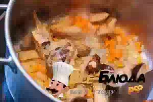 4. После этого можно влить в кастрюлю бульон - мясной или грибной. У меня почти всегда хранится в морозилке запас замороженных бульонов. Если нет бульона, разведите бульонный кубик в воде или залейте овощи с грибами водой из чайника. Поставить кастрюлю на средний огонь, добавить стебли укропа и петрушки, дать бульону закипеть. Снизить огонь и варить под крышкой примерно 10 минут.