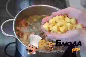 5. Следом добавить картофель. Как только суп повторно закипит, уменьшить огонь до слабого и варить еще 10 минут.