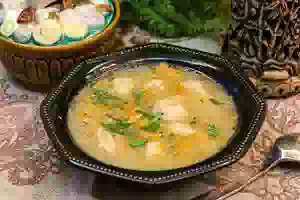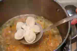 5. В готовый суп положить пельмени. Дать грибному супу еще раз закипеть, уменьшить нагрев до среднего. Как только пельмени всплывут, дать им провариться примерно 5 минут (в моих начинка готовая, варится только тесто). Готовый грибной суп с пельменями разлить по тарелкам и подавать к столу.