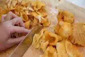 1. Лисички перебрать, промыть, крупные порезать, мелкие оставить целиком.