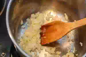 2. Лук очистить, порезать мелкими кубиками. В кастрюле разогреть 1 ст.л. растительного масла, добавить рубленый лук и пассеровать до мягкости.
