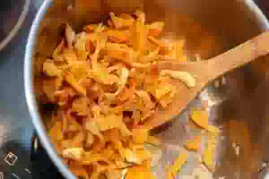 3. Следом отправить в кастрюлю грибы. При необходимости добавить еще растительного масла. Обжаривать лисички, часто помешивая, пока из них перестанет выделяться влага.
