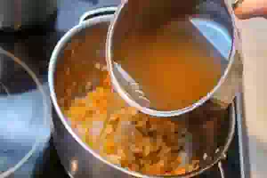 4. Залить грибы с луком водой или грибным бульоном (у меня в морозилке частенько хранится пакет с бульоном, и его надо предварительно растопить). Довести воду до кипения, уменьшить огонь и варить суп, снимая шумовкой пену, примерно 20 минут. Как только на поверхности супа перестанет образовываться пена, посолить по вкусу, положить в кастрюлю лавровый лист и черный перец горошком.