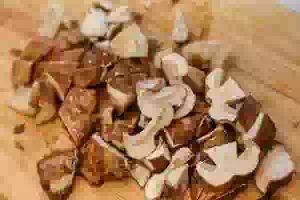 1. Для приготовления грибного супа со шляпок грибов удалить листочки, хвоинки и другой лесной мусор. Для этого достаточно протереть грибы влажной салфеткой или замочить на 10 минут в холодной подсоленной воде. Промытые грибы обсушить на полотенце и нарезать небольшими кусочками.