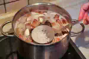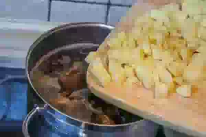 3. Пока варятся грибы, почистить картофель и порезать кубиками. Добавить его в кастрюлю с грибами. Продолжать варить еще примерно 10 минут.