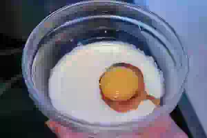 В небольшой миске смешать сливки с яйцом, чуть посолить и размешать венчиком.
