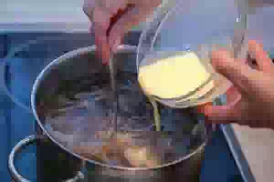 2. Переложить грибы в кастрюлю, залить водой и поставить на небольшой огонь. Как только вода закипит, продолжить варить 30 минут, периодически снимая шумовкой пенку. Когда пена перестанет образовываться, добавить соль.