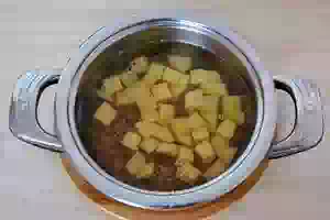 6. В кастрюле доводим воду до кипения, выкладываем промытую гречневую крупу и подготовленный картофель. Ставим на плиту, ждем повторного закипания, уменьшаем огонь до среднего и варим около 10 минут. Если во время варки на поверхности бульона образуется пена, аккуратно снимаем ее.