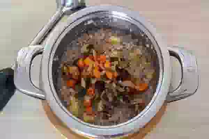 7. Добавляем в кастрюлю обжаренные овощи и пюрируем блендером со стандартной насадкой до однородной массы.
