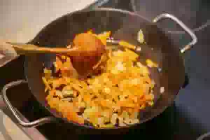 2. Для овощной пассеровки разогреть в сковороде немного растительного масла, добавить мелко нарезанный лук и пассеровать, помешивая, до мягкости. Добавить тертую морковь и готовить все вместе, часто помешивая, еще минуту.