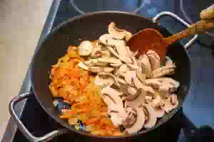3. Грибы вымыть, порезать пластинами и добавить к овощной пассеровке. Посолить грибы, тушить, помешивая, примерно 1 минуту.
