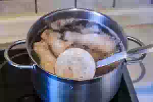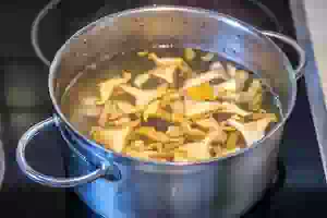 1. Начнем варку грибного супа с приготовления куриного бульона. Для этого положить курицу (или части курицы: ножки, крылышки, грудку, куриный остов) в кастрюлю с холодной водой, довести до кипения и вылить первый бульон. Кастрюлю и мясо промыть под холодной водой, снова налить в кастрюлю воду, положить курятину, целую луковицу и очищенную морковь, поставить на огонь. Как только вода начнет закипать, уменьшить нагрев до минимума и варить, снимая пену. Когда перестанет образовываться пена, бульон посолить, поперчить и варить на минимальном огне примерно еще 40 минут или до готовности мяса. Вынуть из бульона курицу и отделить мясо от костей. Тарелку с мясом на время отставить в сторону. Луковицу и морковь из супа выбросить.