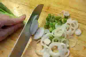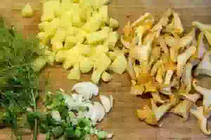 2. Молодой репчатый лук с небольшими луковичками и зелеными перышками и картофель вымыть. Картофель очистить и нарезать кубиками. Лисички промыть, откинуть на дуршлаг и дать воде стечь. Крупные грибы разрезать на несколько частей, мелкие оставить целыми.