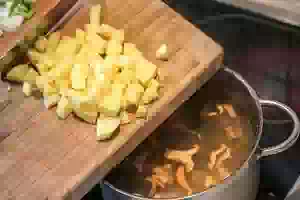 4. В кастрюлю с бульоном отправить лисички. Посолить, приправить молотым черным перцем. Довести до кипения, после чего уменьшить огонь и варить грибной суп 20 минут.