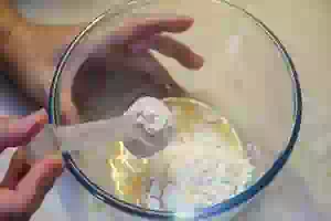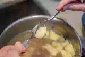 7. Для формовки клецек взять 2 чайные ложки, опустить их в холодную воду. Зачерпнуть тесто одной ложкой, переложить на вторую, снимая ею тесто с краёв ложки. В результате должен получится овальный комочек тесто, который легко соскользнет с ложки в кастрюлю с супом. То же самое проделать с остальным тестом.