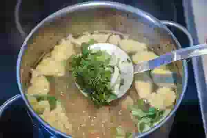 8. Продолжать варить суп при небольшом кипении, пока клецки не всплывут на поверхность. Добавить рубленую зелень, проварить 1-2 минуты. Готовый куриный суп с лисичками и яичными клецками разлить по тарелкам, украсить рубленой зеленью и подавать на стол.