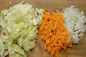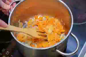 3. В кастрюле разогреть 1-2 ст.л. растительного масла, положить лук и морковь, пассеровать все вместе до прозрачности лука.
