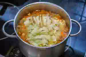 5. Положить в суп капусту, посолить и варить на небольшом огне еще около 10 минут после закипания бульона.