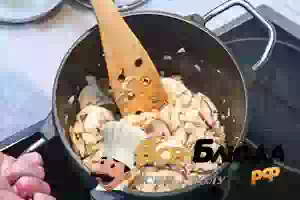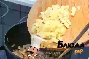 3. В сковороде разогреть растительное масло, слегка обжарить мелко нарезанный лук, чеснок и добавить белые грибы. Готовить, помешивая, все вместе около 10 минут.