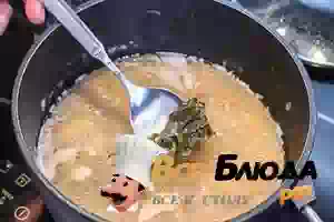 6. Влить куриный бульон, посолить, поперчить по вкусу, довести до кипения, а затем убавить огонь и варить 15-20 минут. По истечении 20 минут, выбросить из супа букет гарни.