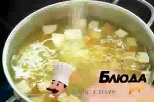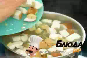 6. Спустя 5 минут добавляем картофель, потом грибы. Варим минут 30-40, чтобы был хороший наваристый грибной бульон, а картофель разварился.