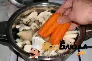 2. Закладываем срезанные ножки и крупные шляпки в кастрюлю, туда же добавляем разрезанную вдоль морковь. Варим не менее 30 минут!