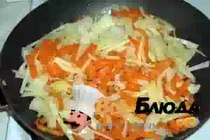 3. Когда время почти истекает, режем на полукольца луковицу и перьями небольшую морковку. Пассеруем в сливочном масле минут 5.