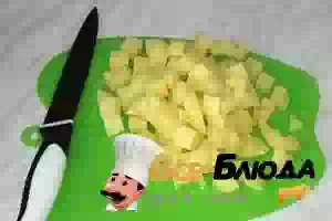 6. Закладываем в кастрюлю порезанный кубиками картофель и лук-морковь-огурец из сковороды. И оставшиеся нежные порезанные шляпки грибов.
