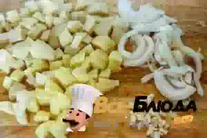1. Картофель очистить и порезать небольшими кубиками. Лук порезать полукольцами, чеснок мелко порубить.