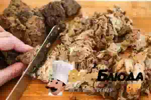 2. Уже заранее сваренные грибы порезать пластинами и разделить на 2 неравные части.