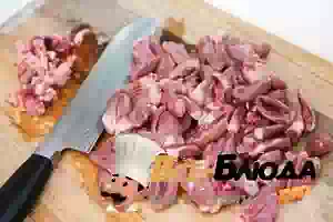 1. Куриные сердечки промыть под проточной водой, откинуть на дуршлаг, чтобы стек излишек воды. Срезать с сердечек лишний жир и вырезать протоки. После этого каждое сердечко разрезать вдоль пополам.