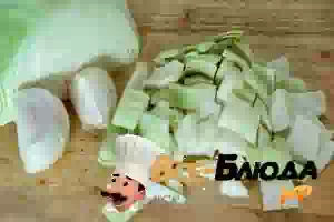 2. Лук почистить, крупно порезать. Капусту порезать шашечками. Так будет удобнее измельчать её для фарша.
