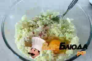 5. Переложить измельченную капусту в миску с фаршем. Добавить яйцо. Приправить солью, сушеной или свежей ароматной зеленью, молотым черным перцем. Вымесить однородный фарш. Если фарш хорошенько отбить о дно миски, котлеты не будут лопаться при жарке.