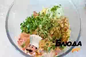 4. Мясной фарш с луком смешать с пюре из нута, добавить рубленую свежую зелень, посолить и поперчить.