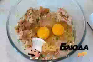 5. Следом добавить сырые яйца и вымешивать фарш для котлет, пока он не станет липким, гладким, однородным.