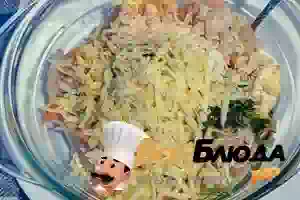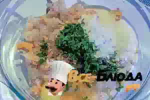 2. Куриное филе вместе с луком измельчаем в мясорубке или блендере. Смешиваем куриный фарш с тертой морковью, манной крупой, рубленым укропом и тёртым сыром.