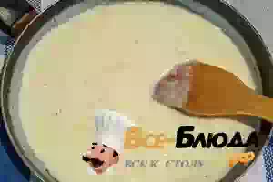 5. Для приготовления соуса в сковороду или сотейник наливаем немного растительного масла, сыплем муку и слегка обжариваем. Затем постепенно добавляем молоко, размешивая муку, чтобы не было комков. Соус должен стать гладким. Солим, кладём в соус 2 лавровых листа и пряные травы. Доводим соус до кипения, снимаем с огня, убираем лавровый лист и даём настояться 20 минут.