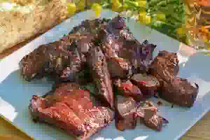 6. Разместить решетку над хорошо прогоревшими углями и готовить, поворачивая решетку то на одну, то на другую сторону, примерно 20-25 минут. За несколько минут до готовности, стейков из говяжьего сердца можно смазать их смесью растопленного сливочного масла с измельченной зеленью и пропущенным через пресс чесноком. Проверить готовность говяжьего сердца, надрезав его в самой толстой части, и если он прожарилось, можно подавать к столу с овощами, зеленью и соусом по вкусу. Говяжье сердце на решетке готово.