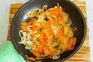 6. Лук обжарить на растительном масле до прозрачности. Добавить к нему морковь и тоже пожарить.
