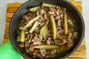 8. Половину говяжьего бульона вылить в сковороду к пассеровке, добавить порезанные почки, один лавровый лист, разрезанные на четвертинки солёные огурцы и тушить 10 минут под крышкой.