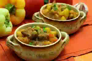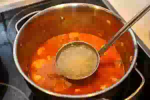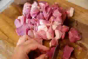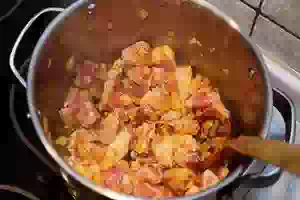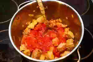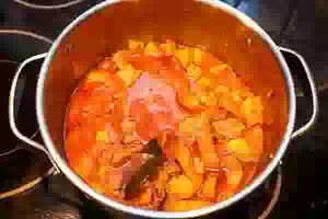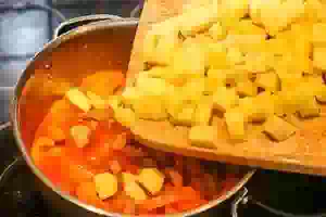 8. Очистить картофель, крупно нарезать, добавить к остальным ингредиентам и готовить, пока картофель не станет мягким.