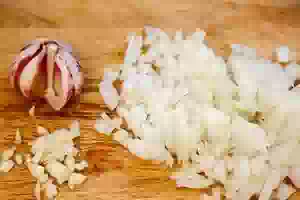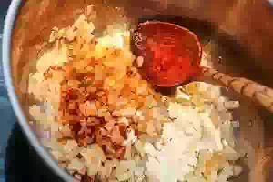 3. В сотейнике или любой другой толстостенной кастрюле подходящего объема разогреть растительное масло, добавить лук и чеснок. Пассеровать, затем добавить муку, два вида паприки, молотые семена тмина. Хорошенько размешать и продолжить готовить, помешивая эту смесь, пару минут.