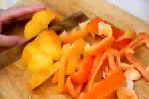 7. Затем добавить нарезанный полосками сладкий болгарский перец и продолжить томить гуляш еще 40 минут, по необходимости доливая бульон и время от времени помешивая его, чтобы не пригорал.