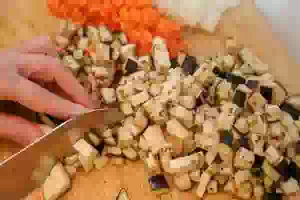4. Подготовить овощи. Очищенный чеснок порубить достаточно крупно. Лук и морковь очистить, нарезать кубиками. Баклажаны вымыть и нарезать такими же кубиками, как морковь.