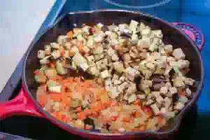 5. В посуде с толстым дном, где обжаривали мясо, разогреть еще 1-2 ст.л. растительного масла и обжарить лук с чесноком, помешивая, примерно 3 минуты. Добавить морковь и баклажаны, продолжить обжаривать еще 5 минут. Положить лавровый лист, паприку, перемешать.