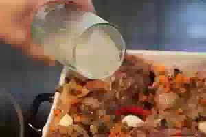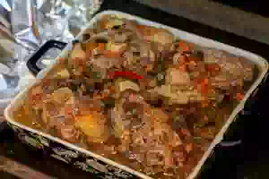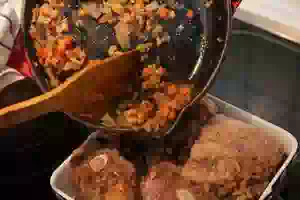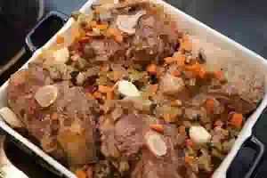 7. Переложить овощи в форму с обжаренными бычьими хвостами.