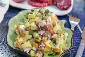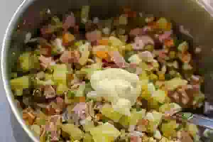 8. Перед подачей салата добавить майонез и снова перемешать. Готово! Оливье с копченой индейкой можно подавать на стол. По желанию украсьте салат листочками петрушки.
